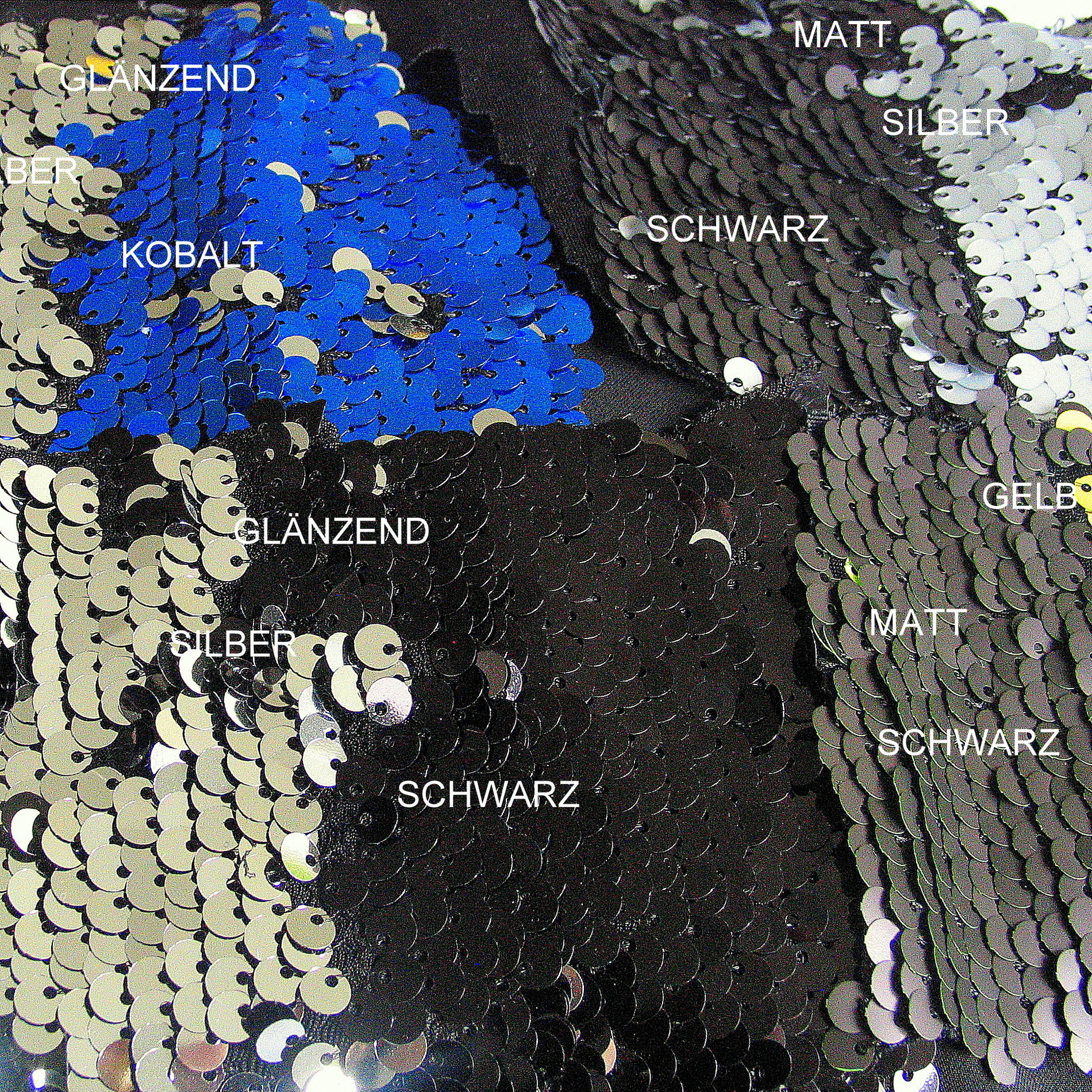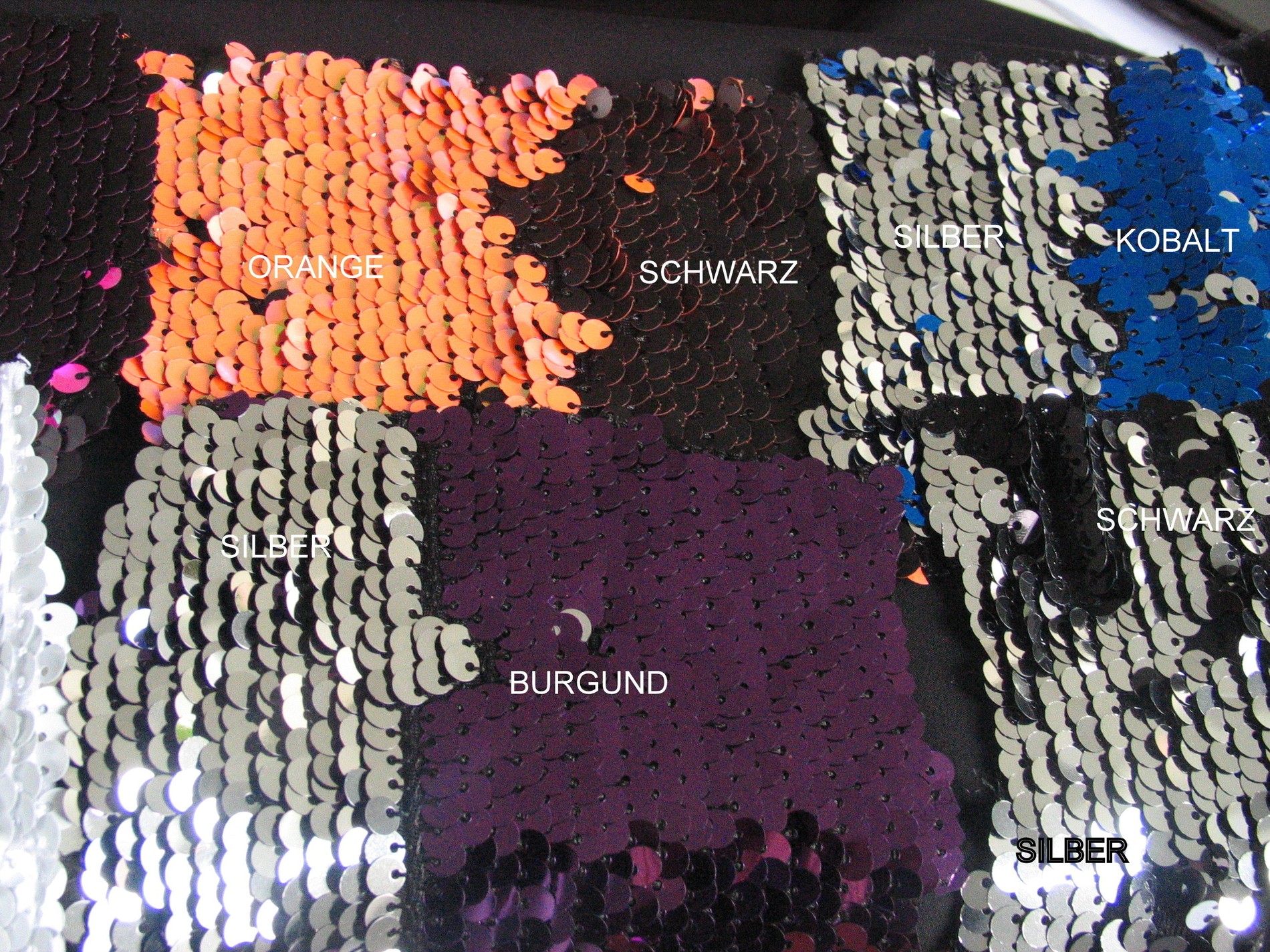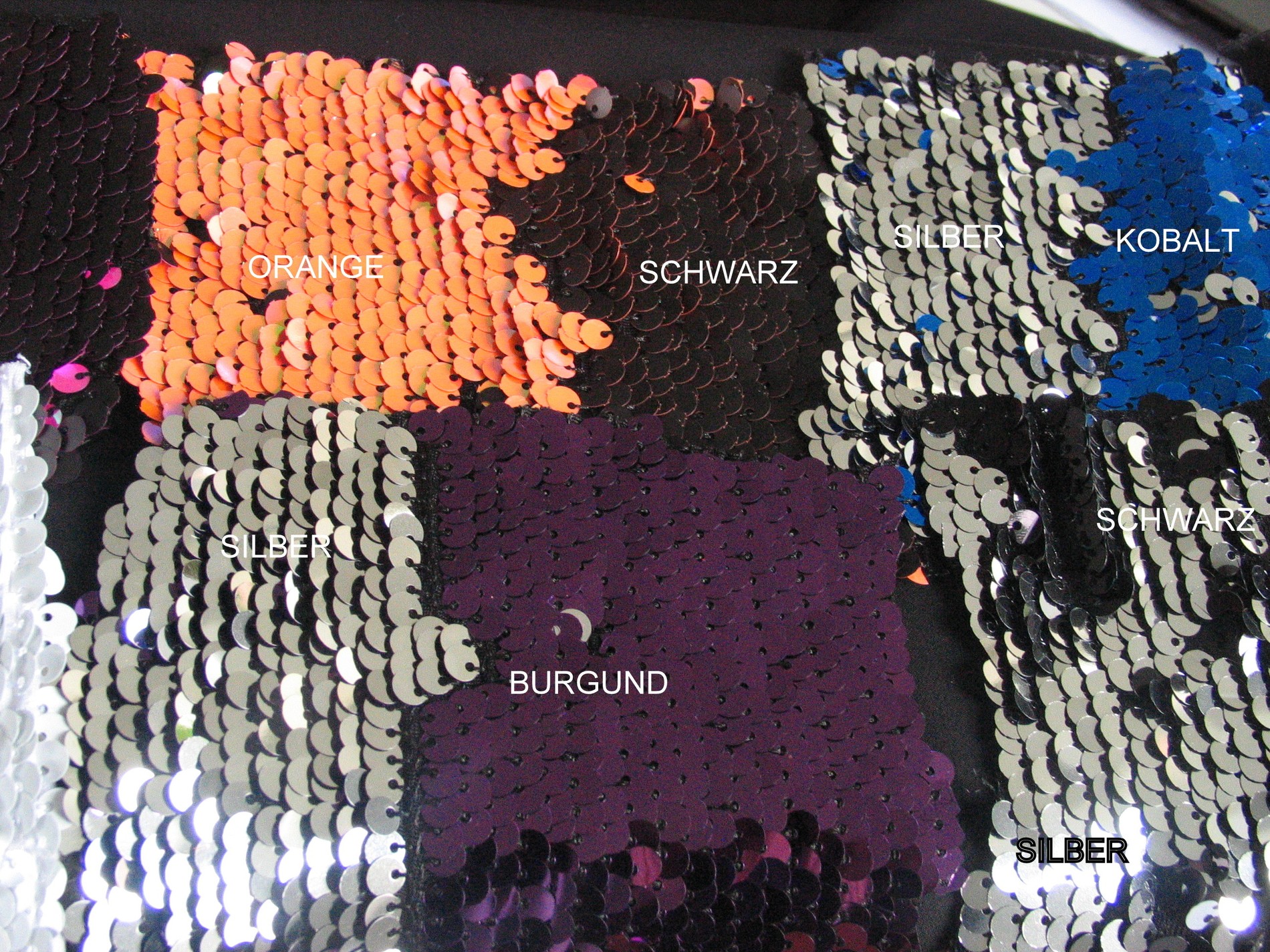 Zauberpailletten:Dieser "Renner" hat jetzt weitere Farben im Sortiment aufgenommen. Sie sehen hier die Bilder teilweise aus unterschiedlichen Lichtwinkeln. Artikel 0794, 0909 und 0910 sind zurzeit lagernd und ab 0,5 Meter bestellbar, solange der Vorrat reicht. Bitte bei der Bestellung die jeweilige Farbe aufgeben. Das Bild gibt nur Beispiele, nicht alle Farben sind im Lager. Bitte geben Sie bei Ihrer Bestellung separat per E-Mail die gewünschte Farbkombination an. Hier kaufen Sie die neue Farbe schwarz-Silber, die Pailletten haben einen Durchschnitt von 0,5 cm.