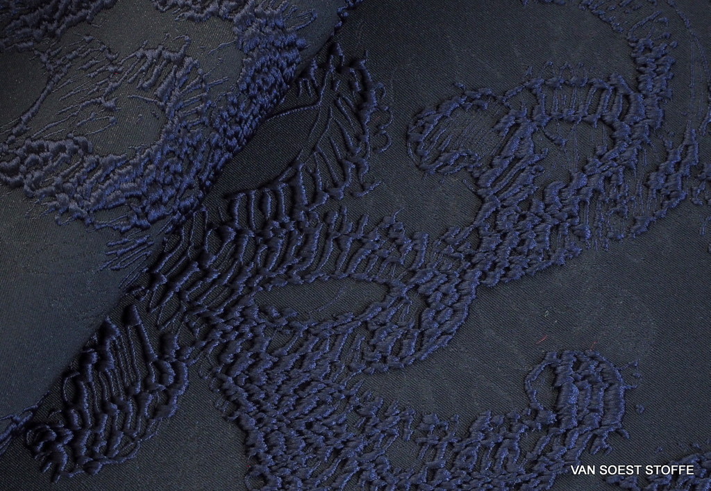 Sensationeller von beiden Seiten zu verarbeitendem Doppeljacquard Gewebe in dunkel Navy. Die schwere Ware besticht durch die doppelseitige 3 D Muster in einzigartiger Mustergestaltung. Neueste Webentwicklung - made in Italy. Leichter Stretch durch Elastan Beimischung. Ebenfalls in Schwarz vorhanden - Art. 1364.