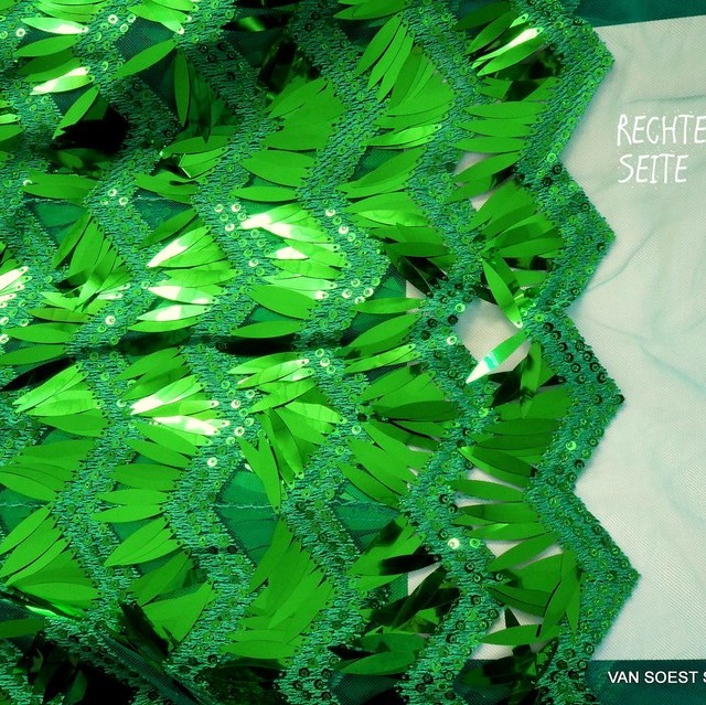 Neues Produkt in unserer wachsenden Serie ausgefallener Stoffe. Hier ein Spezial mit längs Pailletten bestickter Stoff mit Smaragd Grünen Pailletten auf weichen Tüll in Farbe Grün. Sehr ausgefallen....Nur Testmenge 6 Meter vorhanden, später mehr.
