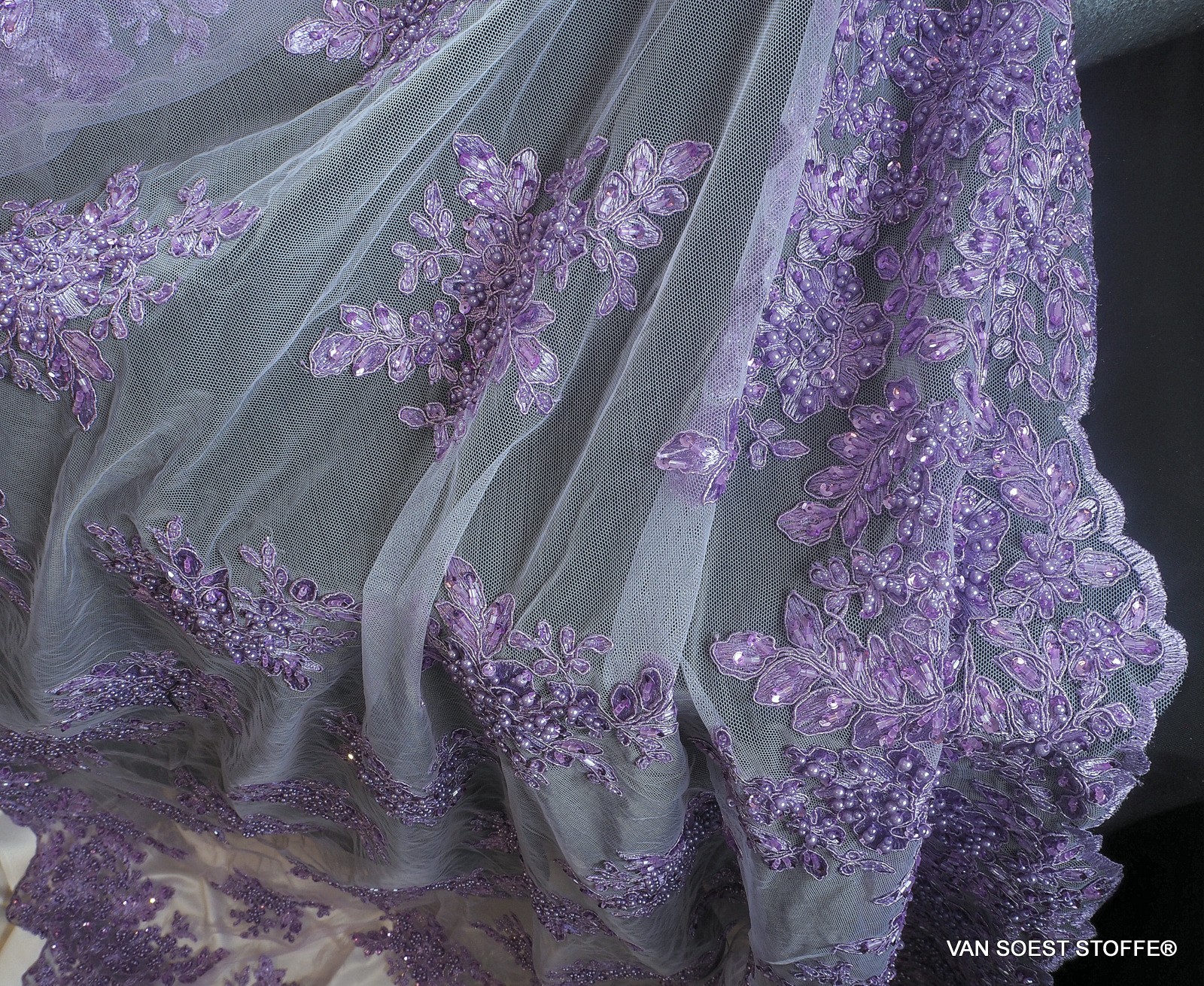 Schwere Lila 3D Spitze mit Lila Perlen Stäbchen und lila mini Pailletten