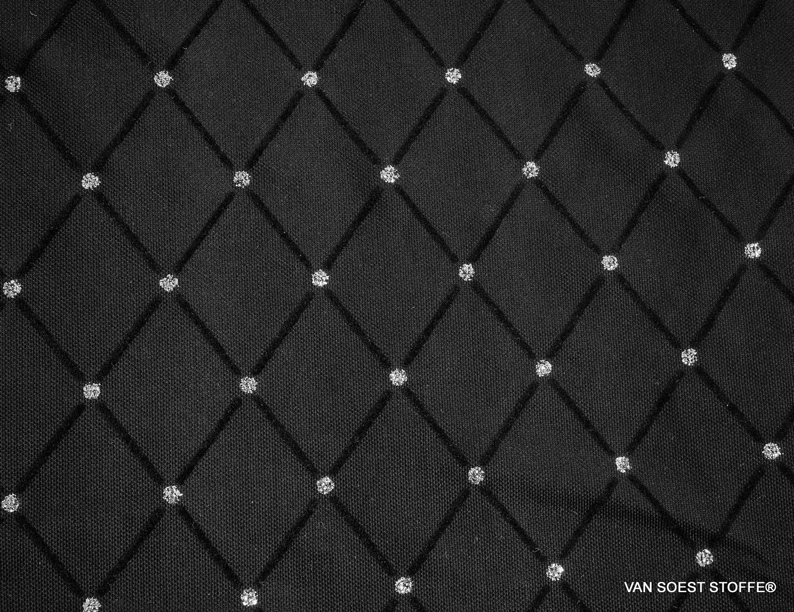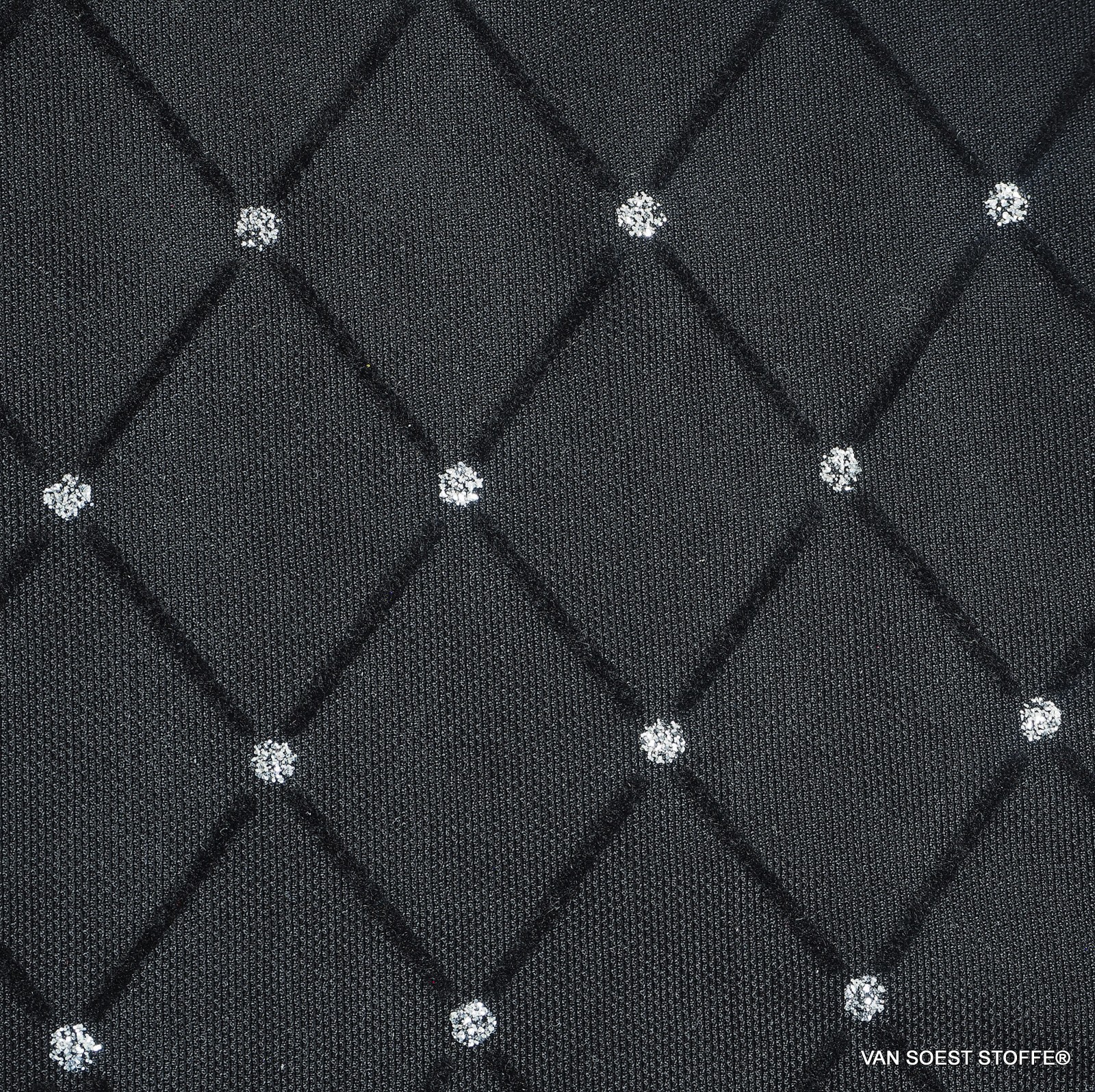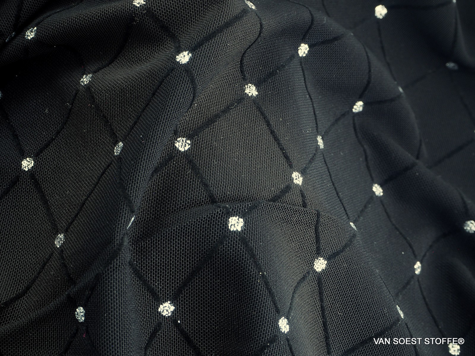 Schwarzer High Stretch Rauten flock Print mit silbernen Punkten auf schwarzem Stretch Tüll. Rautengröße 5x4cm. Durch die hohe Transparenz können Sie zusätzlich neue interessante Farbkombinationen entwickeln z.B. durch Kombination mit uni oder gemusterte Stoffen.