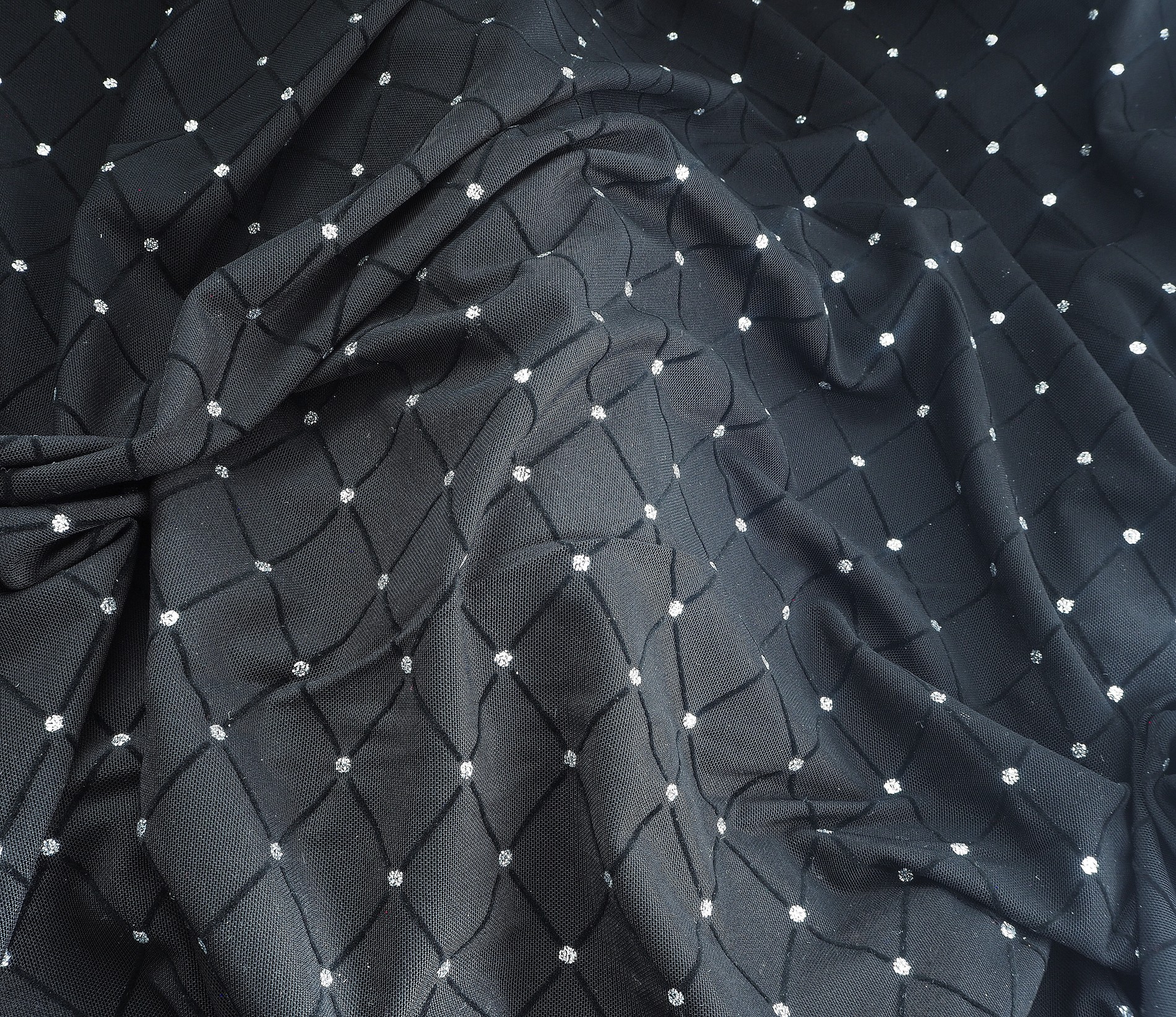 High Stretch schwarzer Rautenflockprint mit silbernen Punkten auf schwarzem Tüll