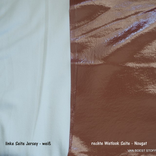 Wet Look Vinyl - Neues Fashion Produkt: Stretch und Wet Look in der Farbe Nougat, Abseite Jersey in der Farbe Weiß. Für alle, die von diesem tollen Look begeistert sind. Die Ware ist super weich und hat eine sehr angenehme weiche Abseite, sodass Füttern nicht nötig ist. Die quer stretchige Ware ist z.B. auch super geeignet für enge Leggins.