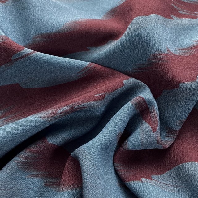 100% Viskose Print mit Rot-Blauen Landscape Streifen. Mittleres Gewicht. Neues innovatives Print Dessin. Wunderbar weiche Ware mit fliessendem Fall. Sehr gut geeignet für moderne Blusen & Kleider. Die Ware ist limitiert.