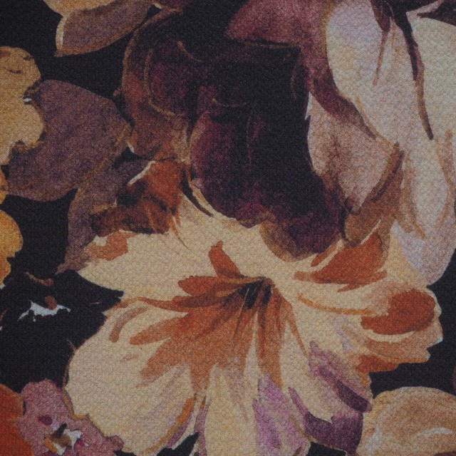 Wunderschöne Herbsstöne & eine klassische Blütenpracht auf schwarzem Grund. Eine leichte, fliessende Ware, mit einem sehr angenehmen, trockenen Griff & leichtem Stretchanteil. Dieser Stoff ist sehr gut geeignet für Kleider, Blusen, Röcke und Jumpsuits.