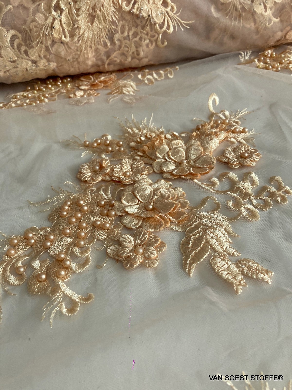 Art. No.: 2347-Honig Farben Spitze 3D Blüten & Blätter & großen Perlen auf Tüll